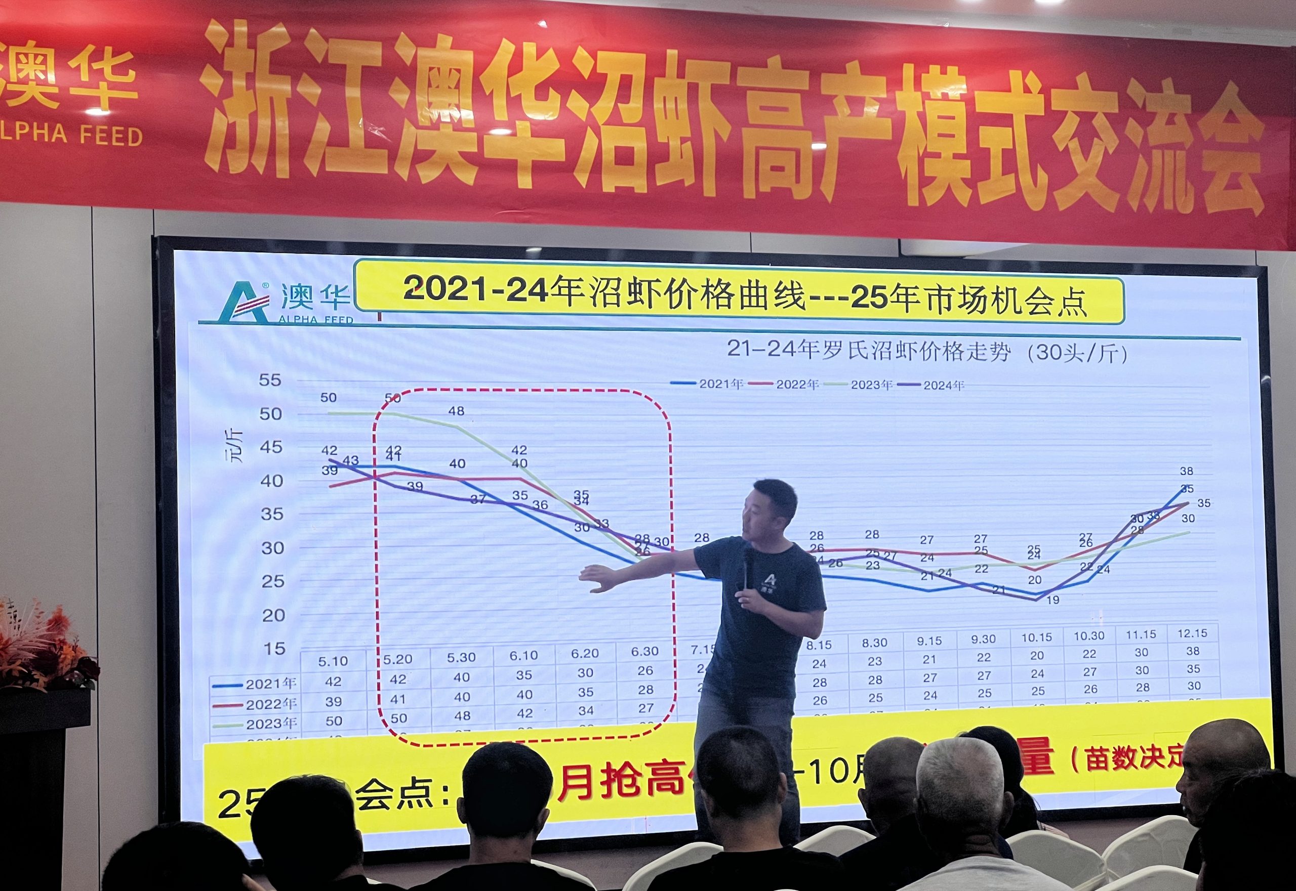 現場,澳華集團華東大區價值交付經理彭建慶,帶來一場幹貨滿滿的羅氏沼蝦高産模式主題分享。他以詳實數據為基礎,系統梳理了2024年養殖過程中的痛點與難點,并結合近五年羅氏沼蝦價格走勢,精準剖析了2025年的市場機遇。他提出“5-6月主攻高價上市,7-10月聚焦産量沖刺”的策略,強調“早出蝦、多出蝦”的核心思路,為養戶清晰指明了全年盈利方向。
