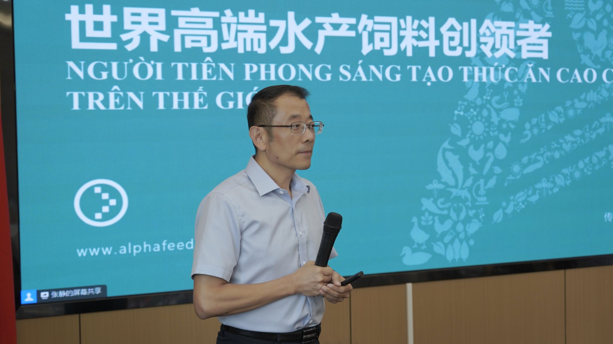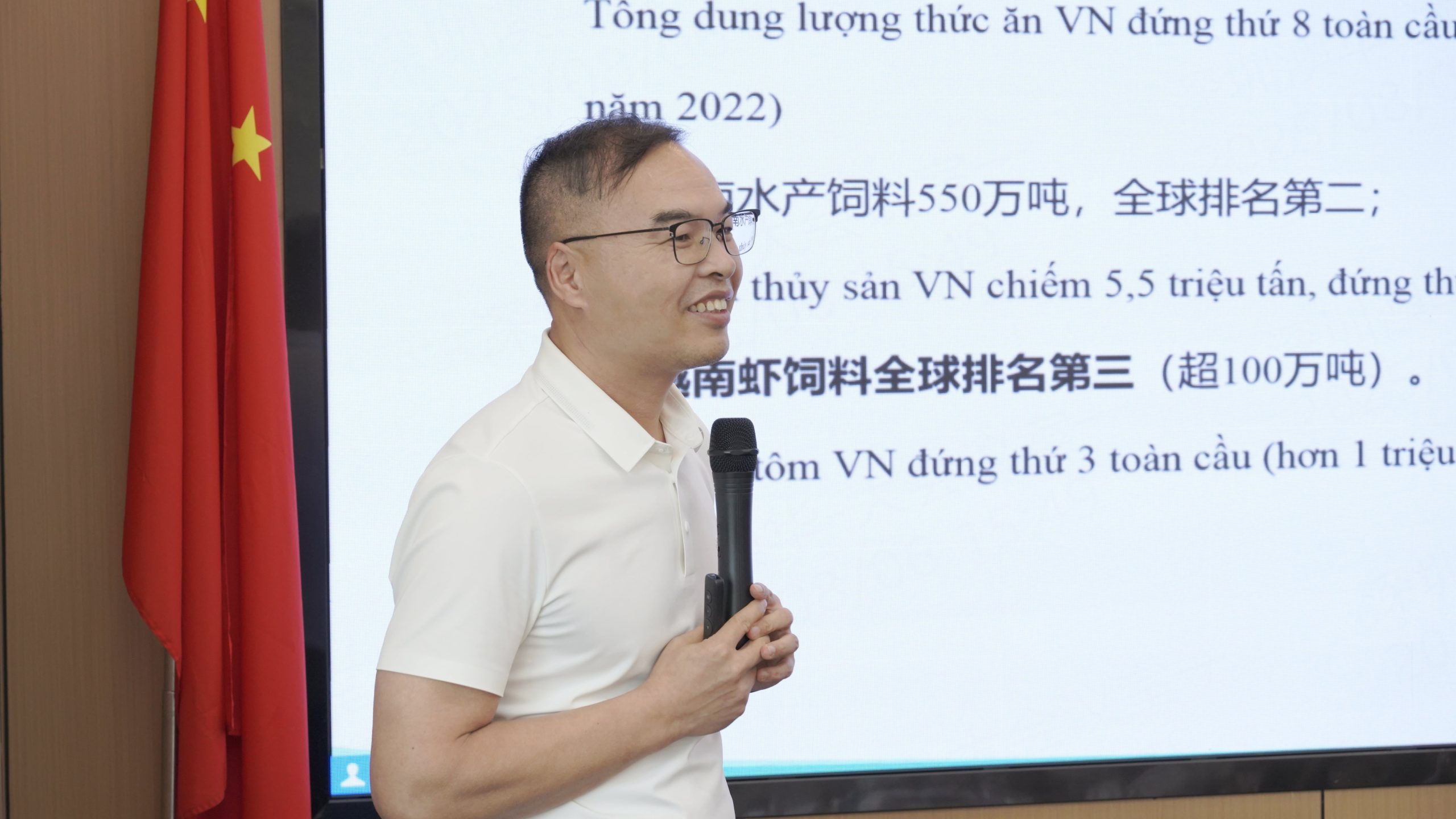 助理總裁兼營銷中心負責人喻明波深入分析了越南蝦料市場的現狀與趨勢。他指出,在存量競争背景下,優質養殖戶和代理商将更關注飼料質量,并傾向選擇高檔飼料。喻總表示,越南澳華專注打造高品質蝦料,其明星産品“蝦奶粉”全球銷量領先,充分證明了澳華蝦料的品質優勢。