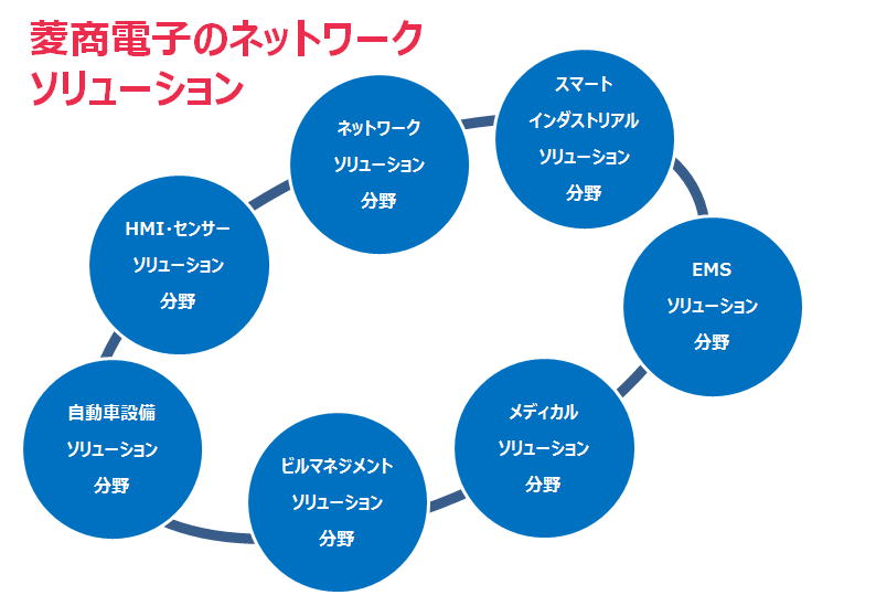 事業領域や経営戦略、方向性によって、お客様が抱える課題も課題解決のために必要とされるソリューションも様々です。菱商電子は多岐にわたるソリューションサービスを国内外で幅広く提供しています。 ネットワークソリューション分野、ビルマネジメントソリューション分野、EMSソリューション分野、スマートインダストリアルソリューション分野、メディカルソリューション分野、HMI・センサーソリューション分野、自動車設備ソリューション分野、全ての分野において菱商電子の強みを活かしたベストなソリューションを提供します。菱商電子はこれからも新たなソリューションを開発・提供しお客様の未来を支援していきます。